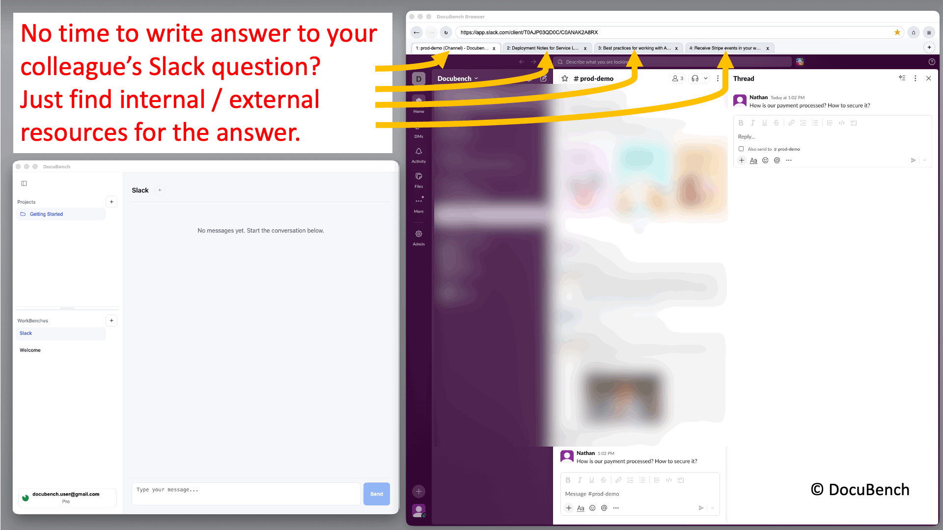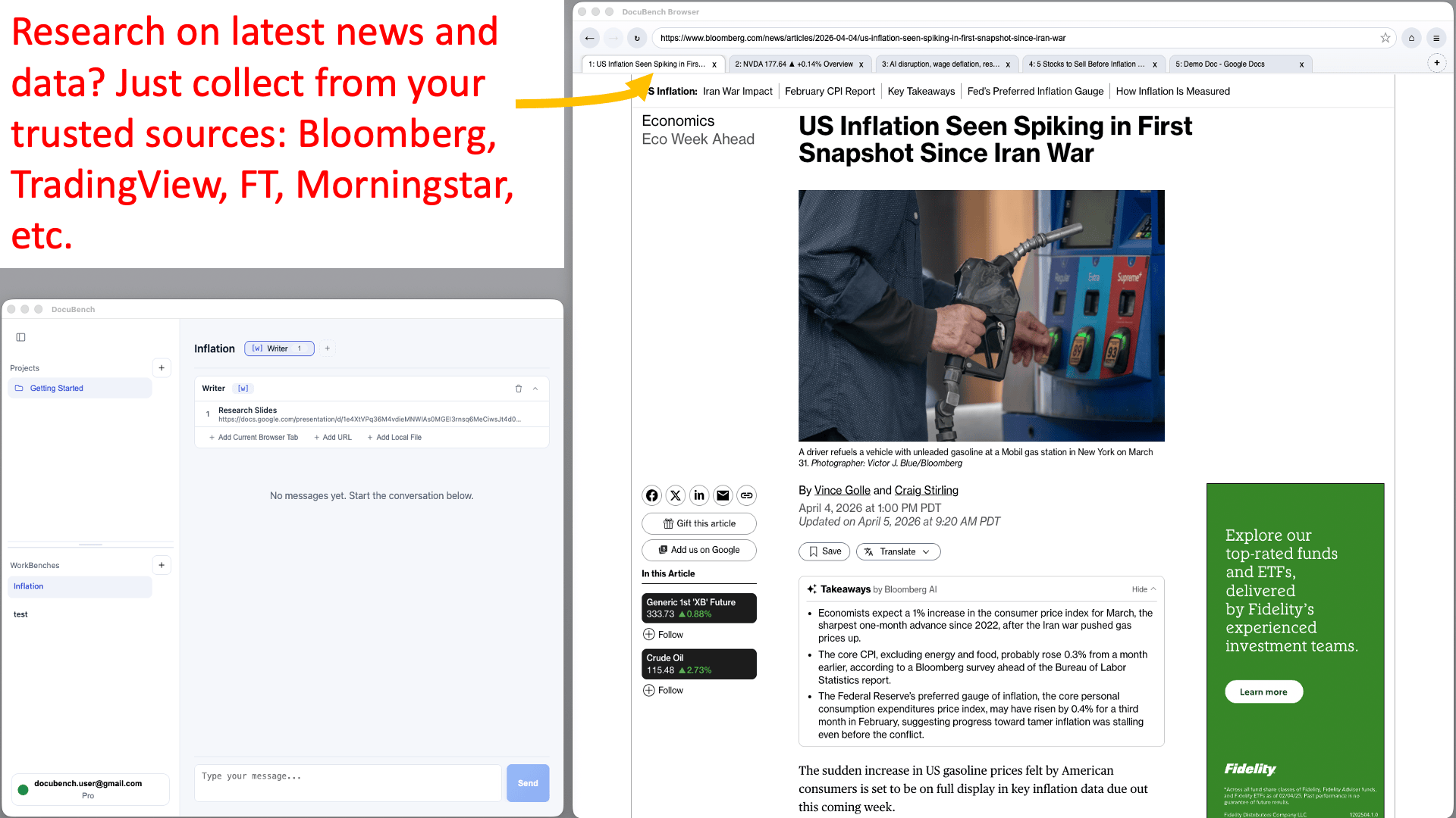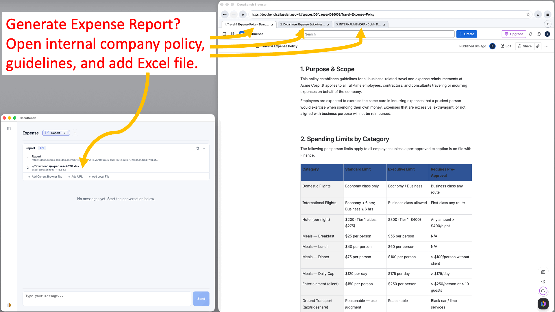 DocuBench lets you pull from tabs, files, and documents — all at once — and deliver results with agents. No copy-pasting. No lost context. Just work, finished.